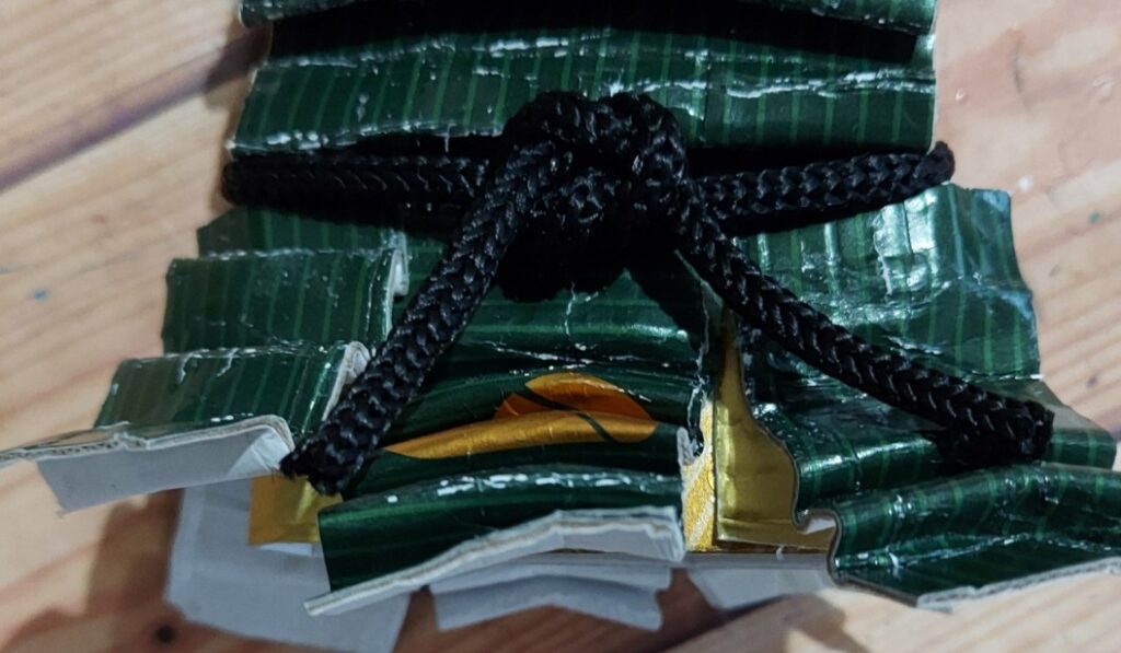 新聞紙と広告を丸めて、次にボンドで貼っています