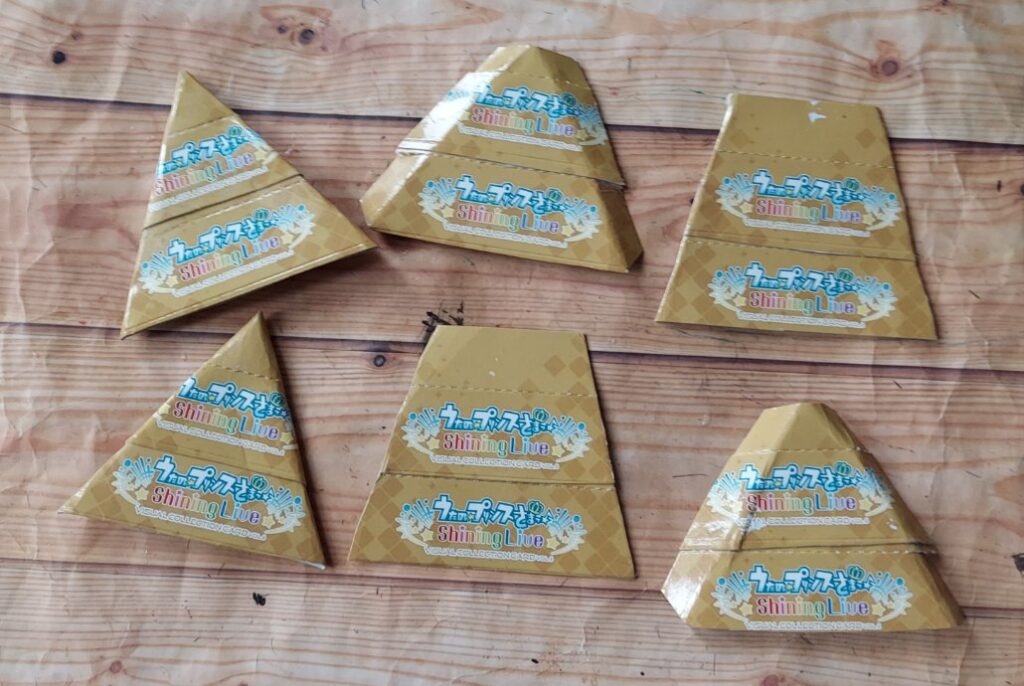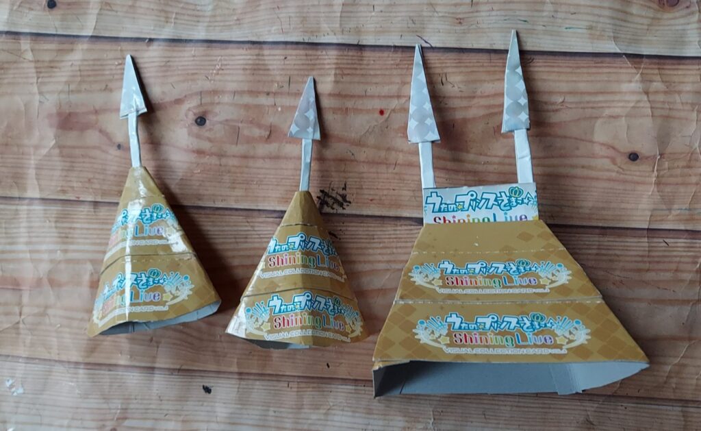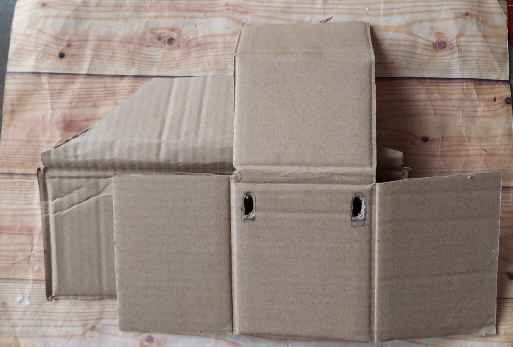 ① 空き箱でロゴの所を、次に三角屋根です